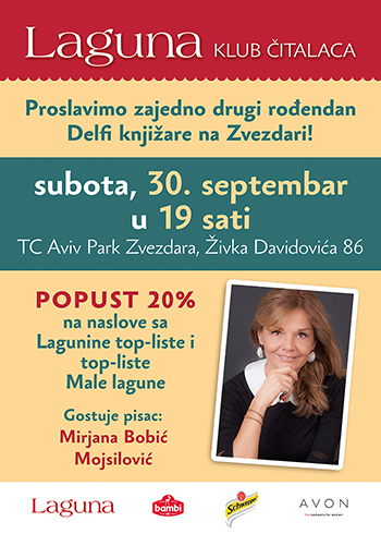 U subotu, 30. septembra, knjižara Delfi u tržnom centru Aviv Park u Ulici Živka Davidovića 86, na Zvezdari, zvanično će proslaviti drugi rođendan. Proslavu će uveličati poznata srpska autorka Mirjana Bobić Mojsilović, koja će zvanično otvoriti proslavu u 19 sati i predstaviti svoje knjige. Svi posetioci biće u prilici da razgovaraju sa svojom omiljenom spisateljicom i obezbede potpisane primerke njenih knjiga.