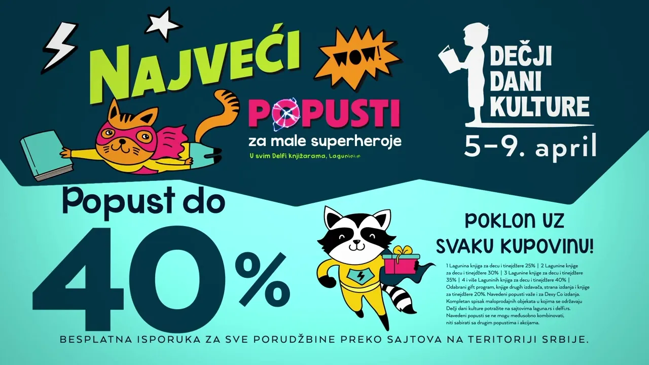 Očekuju vas veliki popusti na Lagunine knjige za decu i druženja sa piscima! Popust na jednu Laguninu knjigu za decu iznosiće 25%, na dve 30%, na tri 35%, a na četiri ili više knjiga 40%. Navedeni popusti primenjivaće se i na Dexy Co. i Egmontova izdanja, ali bez mogućnosti da se kombinuju sa popustima na izdanja drugih izdavača. Naslovi odabranih izdavača biće na popustu od 20%, dok će odabrani gift program biti snižen do 20%. Navedeni popusti se ne mogu kombinovati sa drugim popustima i akcijama.