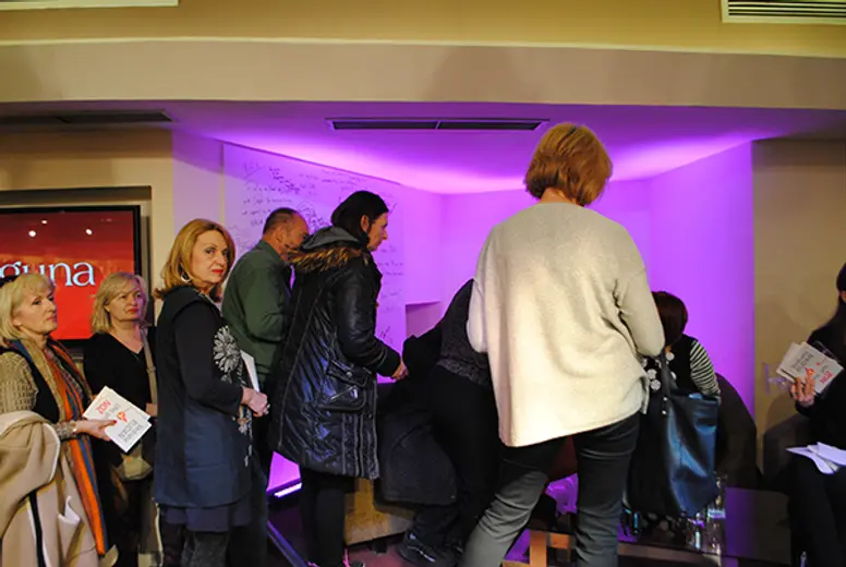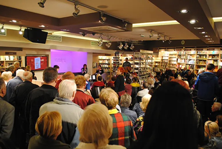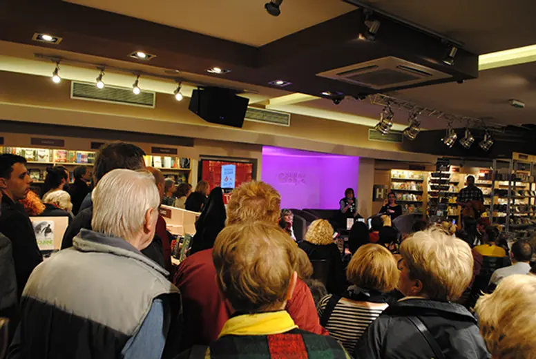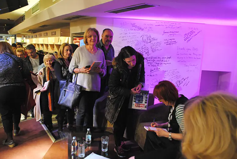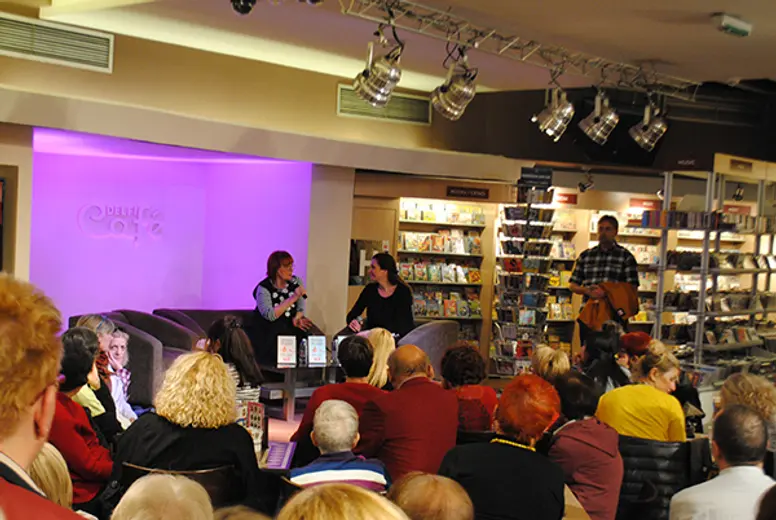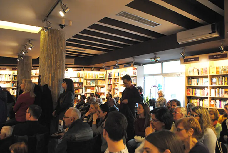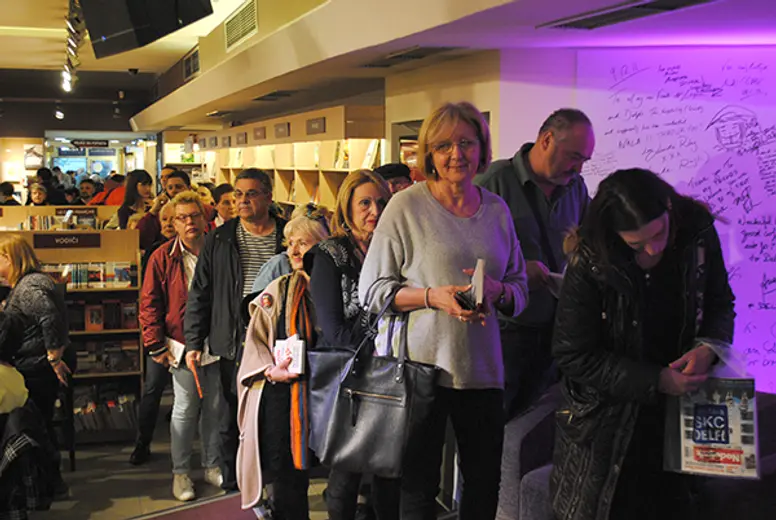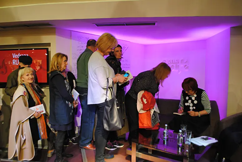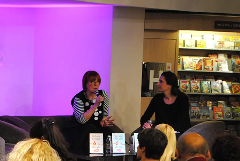 „Muž mi je odgovorio da je bolje da pišem knjige nego da kupujem cipele“, rekla je Vedrana i razveselila okupljene u knjižari Delfi. „Stvarno obožavam cipele i volim ih kupiti u Beogradu. Umesto besumučne kupovine cipela, napisala sam ’Uho, grlo, nož’, u kojem je sve istinito osim opisa seksa.“