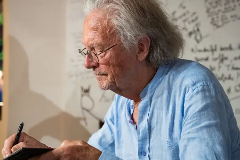 Peter Handke (1942, Grifen, Austrija) jedan je od najznačajnijih pisaca nemačkog jezika i savremene svetske književnosti. Pisac stotinak knjiga, romana, pripovesti, drama, poezije, eseja i filmskih scenarija; autor više filmova, i koautor i saradnik u mnogim filmovima Vima Vendersa; likovni ilustrator svojih tekstova. Dobitnik niza nagrada: Bihnerove, Kafkine, Šilerove, Ibzenove, Nestrojeve, nagrade „Tomas Man“, nagrade „Milovan Vidaković“ i drugih. Nobelova nagrada za književnost dodeljena mu je 2019. „zbog uticajnog rada koji sa lingvističkom genijalnošću istražuje periferiju i posebnost ljudskog postojanja.“ Handkeov prvi roman Stršljenovi i prva drama Psovanje publike objavljeni su 1966. Iste godine se na sastanku Grupe 47 u Prinstonu u SAD distancirao od „opisivačke“ književnosti novog realizma i utvrdio poziciju svoje književnosti kao usmerenost na jezik i na odnos jezika i sveta. Motiv ugroženog subjekta u problematičnoj komunikaciji sa spoljašnjim svetom karakterističan je za rana Handkeova ostvarenja, kao što su romani Golmanov strah od penala (1970), Bezželjna nesreća (1972), Kratko pismo za dugo rastajanje (1972) i Levoruka žena (1976), potom proslavljeni dramski komad Kaspar (1968) ili zbirka poezije Unutrašnji svet spoljašnjeg sveta unutrašnjeg sveta (1969). Knjiga Spori povratak kući (1979) predstavlja prekretnicu u Handkeovoj književnosti i okretanje prirodi i materijalnosti sveta, gde su film i slikarstvo izvori književne inspiracije. Istovremeno je u Handkeovim ostvarenjima prisutno neprekidno traganje za smislom postojanja. Otuda su lutanje i migracija primarni modus aktivnosti i aktivizma, a put je mesto za tzv. „epski korak“, koji nije posebno vezan za određeni žanr. Njegovom delu je otad svojstven snažan avanturistički duh, ali i nostalgija, koji su uočljivi u pripovestima kao što su Pouka planine Saint Victoire (1980), Ponavljanje (1986), Još jedanput za Tukidida (1990), Zimsko putovanje do reka Dunava, Save, Drine i Morave ili Pravda za Srbiju (1996), Moravska noć (2008) i Veliki Pad (2011) ili u dramama Vožnja čunom ili komad za film o ratu (1999) i Lepi dani u Aranhuezu (2012). Peter Handke je oduvek mnogo vremena provodio izvan Austrije i na putovanjima, a od 1990. pretežno živi i radi u Francuskoj. Foto: © Jerry Bauer / Suhrkamp Verlag