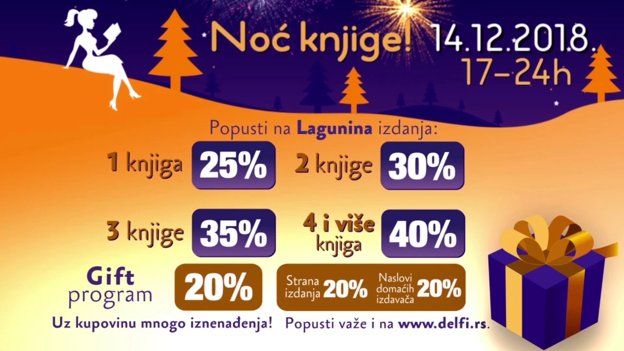 U petak 14. decembra od 17 sati do ponoći u Laguninim klubovima čitalaca i knjižarama Delfi održaće se devetnaesta regionalna manifestacija Noć knjige pod pokroviteljstvom Eurobank Srbija.