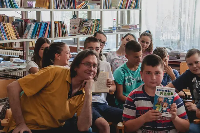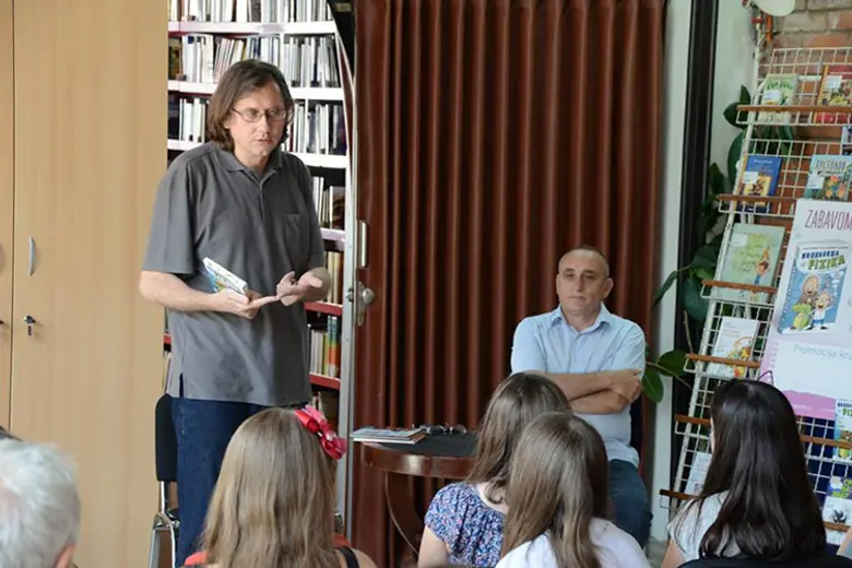 Branko je citirao velike naučnike, sa đacima dokazivao zakone fizike, čitao odlomke iz knjige i odgovarao na pitanja, ali govorio je i o drugom piscu za decu, Igoru Kolarovu, nedavno preminulom koautoru ove knjige. Govorio je o Ajnštajnu, Tesli, Milankoviću, Njutnu, a potom je citirao Kolarova i Gradimira Stojkovića, pisca dečje omiljene knjige „Hajduk u Beogradu“, koji ga je pratio pogledom iz publike.