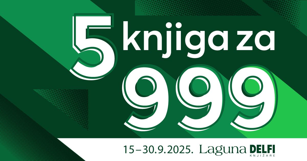Akcija „5 za 999“ važi od 15. do 30. septembra 2025. na odabrane naslove u izdanju Lagune u svim Delfi knjižarama i na sajtu delfi.rs. Ovaj popust se ne može kombinovati s ostalim popustima i akcijama. Spisak naslova potražite na kasi i sajtu.