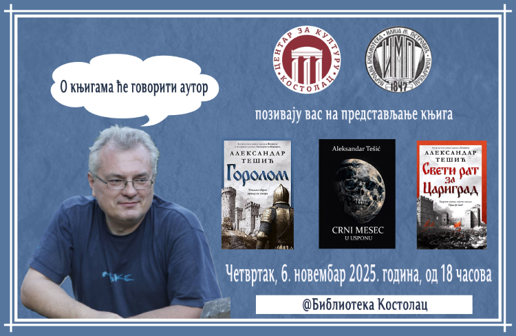 Biblioteka u Kostolcu, Ogranak Narodne biblioteke „Ilija M. Petrović“ Požarevac i Centar za kulturu „Kostolac“, pozivaju vas da dođete u četvrtak 6. novembra od 18 sati na predstavljanje knjiga našeg poznatog pisca Aleksandra Tešića, autora kultnog serijala „Kosingas“.