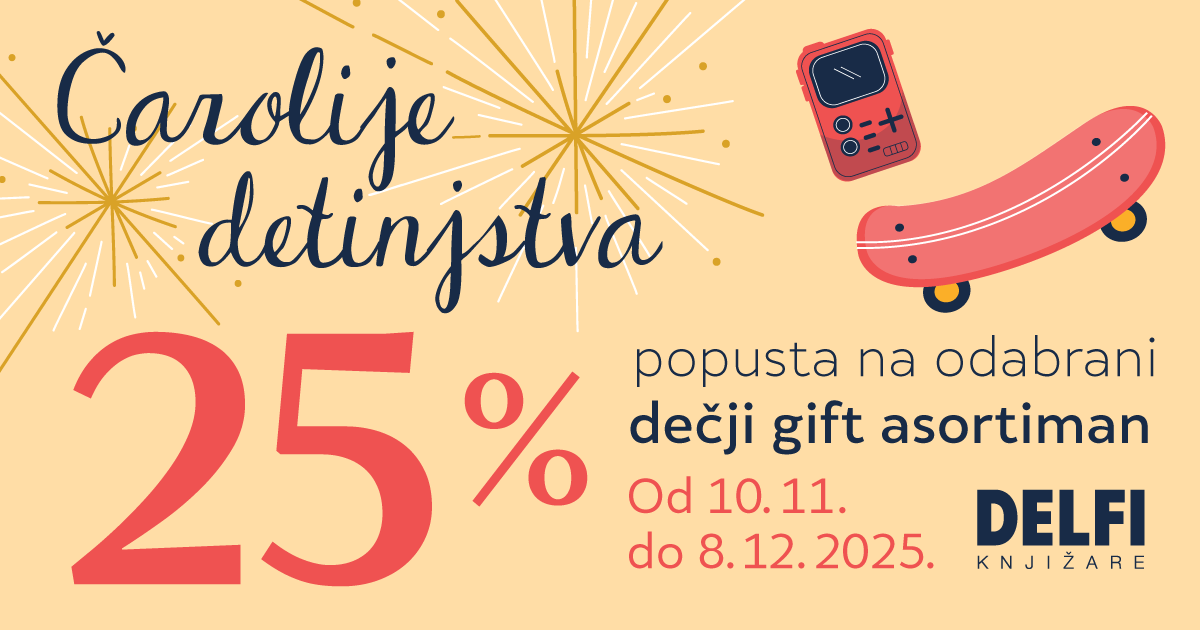 Od ponedeljka 10. novembra pa sve do 8. decembra 2025, u svim Delfi knižarama i na sajtu delfi.rs, važi sjajna akcija „Čarolije detinjstva“, u okviru koje za odabrani gift asortiman dobijate 25% popusta!