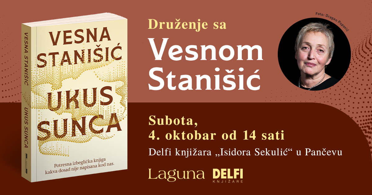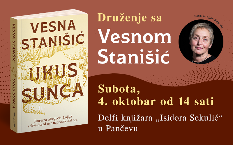 Delfi knjižara „Isidora Sekulić“ u Pančevu će u subotu 4. oktobra od 14.00 ugostiti Vesnu Stanišić, dramaturškinju, producentkinju i autorku „Ukusa sunca“, potresne izbegličke knjige kakva dosad nije bila napisana kod nas.