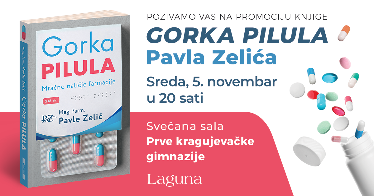 U Svečanoj sali Prve kragujevačke gimnazije, u sredu 5. novembra od 20 sati, održaće se promocija nove knjige Pavla Zelića, „Gorka pilula – Mračno naličje farmacije“. Autor, magistar farmacije, pisac i scenarista, poznat po romanima, zbirkama priča i stripovima, ovom knjigom ulazi u kompleksan svet farmaceutske industrije, otkrivajući njene tamne strane kao stručnjak i insajder koji iznosi brojne ekskluzivne informacije i otkrića o kojima ni javnost u svetu pa ni Srbiji ranije nije bila upoznata.