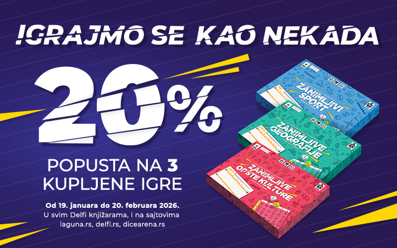 Kupovinom kompleta društvenih igara iz serije „Igrajmo se kao nekad“: „Zanimljive geografije“ „Zanimljive opšte kulture“, „Zanimljivi sport“ ostvarite 20% popusta od 19. januara do 20. februara 2026. u svim Delfi knjižarama i na sajtovima laguna.rs, delfi.rs i dicearena.rs.