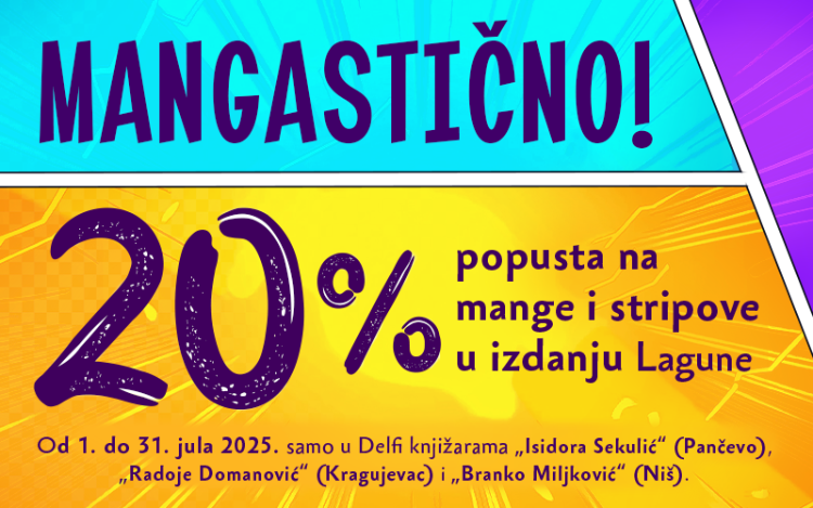 Ljubitelji mangi i stripova, spremite se za pravu letnju poslasticu! Od 1. do 31. jula 2025, u tri odabrane knjižare – „Isidora Sekulić“ u Pančevu, „Branko Miljković“ u Nišu i „Radoje Domanović“ u Kragujevcu – važi 20% popusta na sve mange i stripove u izdanju Lagune.