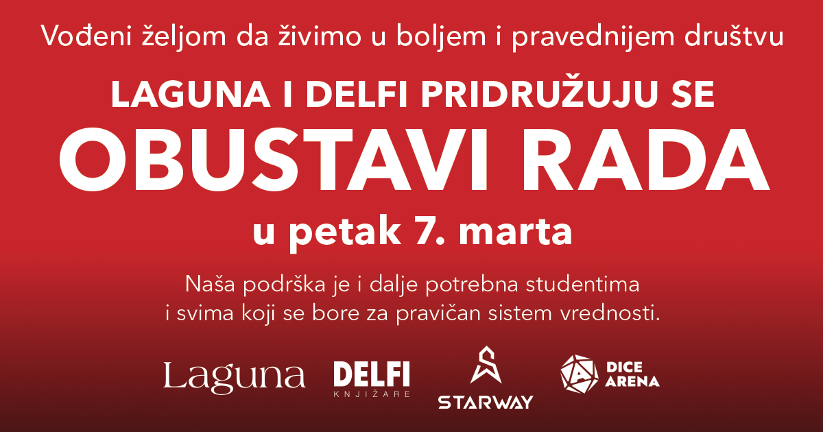 Vođeni željom da živimo u boljem i pravednijem društvu, Laguna i Delfi pridružuju se u petak 7. marta obustavi rada.