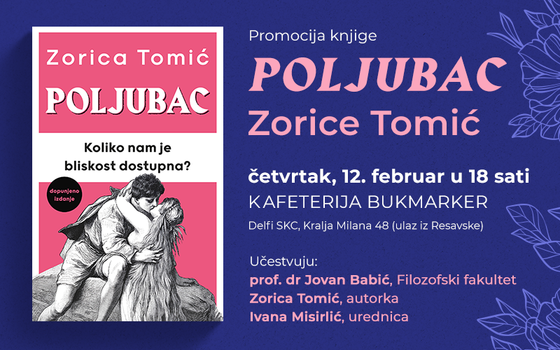 Knjiga „Poljubac“ prof. dr Zorice Tomić biće predstavljena 12. februara od 18 sati u knjižari Delfi SKC. O knjizi će, pored autorke, govoriti i prof. dr Jovan Babić sa Filozofskog fakulteta, i urednica Ivana Misirlić.