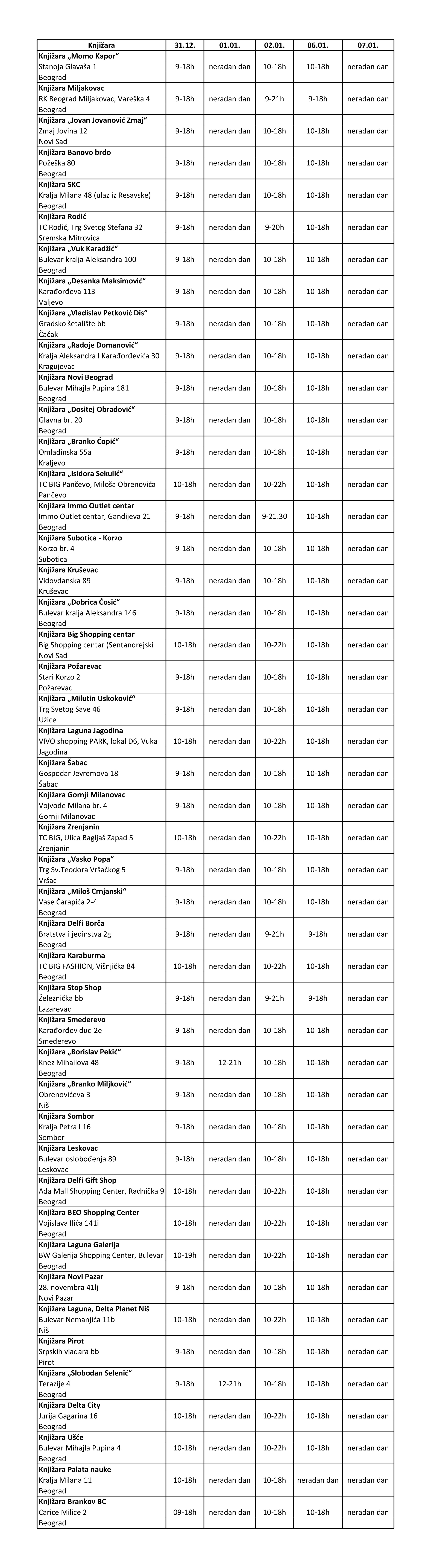 Tokom novogodišnjih praznika, knjižare Delfi radiće po sledećem rasporedu: