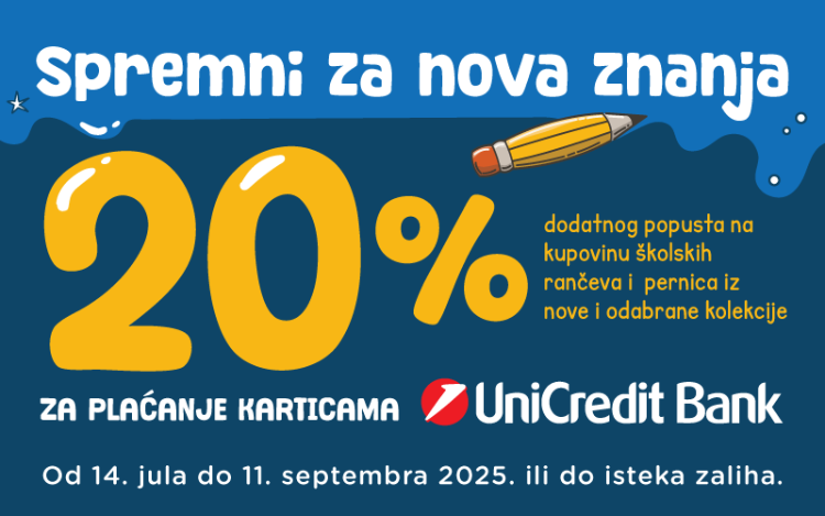 Ovo je izvanredna prilika da svoje školarce opremite kvalitetnim rančevima i pernicama po najpovoljnijim cenama. Uz dodatni popust od 20% koji svojim korisnicima donosi UniCredit Bank, dani uoči novih školskih izazova biće bezbrižni.
