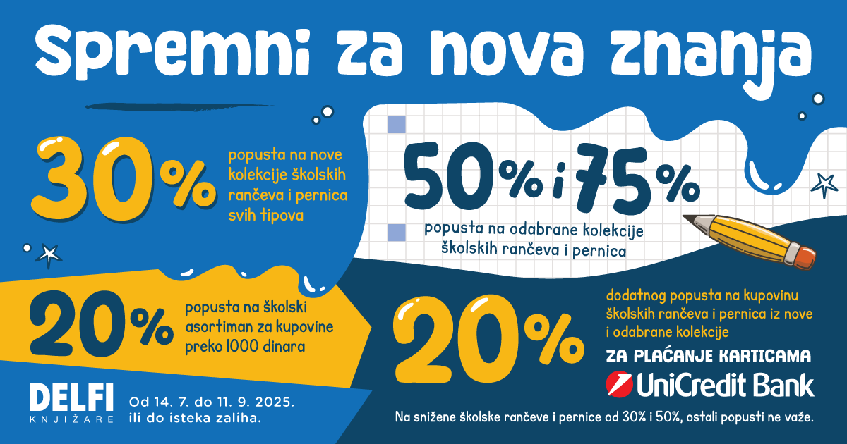 U knjižarama Delfi i na sajtu delfi.rs u toku je sjajna akcija „Spremni za nova znanja“, u okviru koje važe sjajni popusti od 30% i 50% za nove i odabrane kolekcije školskih rančeva i pernica vodećih svetskih brendova.