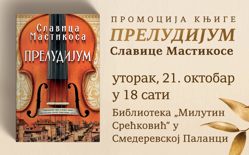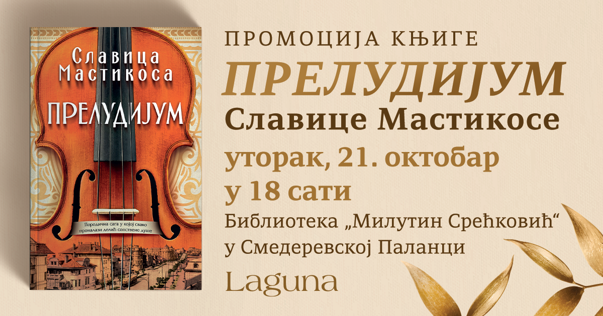 U Biblioteci „Milutin Srećković“ u Smederevskoj Palanci, 21. oktobra od 18 sati, autorka Slavica Mastikosa predstaviće roman „Preludijum“, uz osvrt i na druga svoja književna ostvarenja u izdanju Lagune.