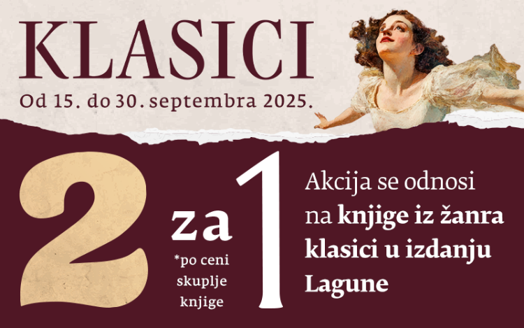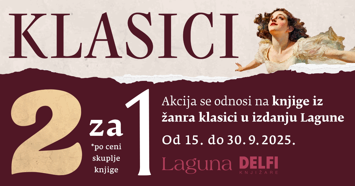 Akcija važi isključivo za klasike u izdanju Lagune, a popusti se ne sabiraju sa članskim, količinskim i drugim pogodnostima. Kompletan spisak knjiga koje učestvuju u akciji potražite na kasi ili na sajtovima laguna.rs i delfi.rs.