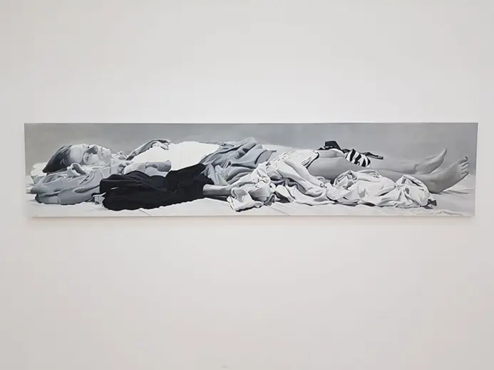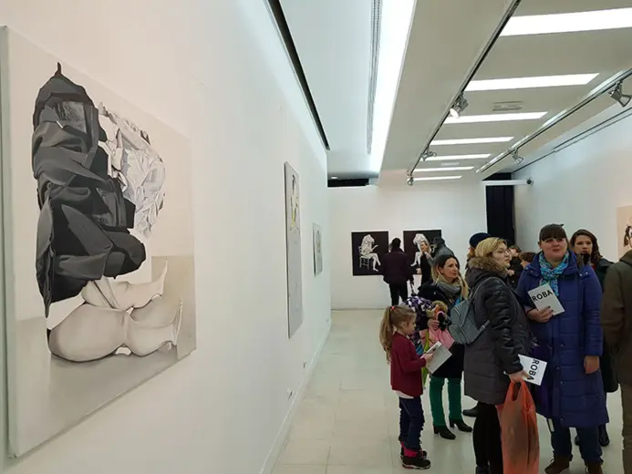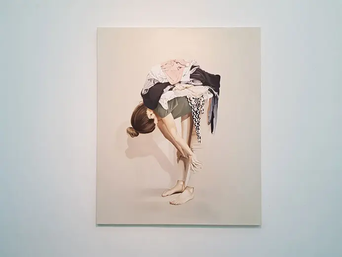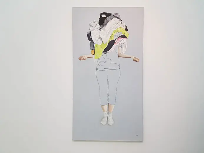 Slikarka Jelena Marjanović već duže vreme u svojim radovima bavi se temama koje problematizuju i preispituju položaj žene u savremenom društvu. U svom novom ciklusu slika pod nazivom „Roba“ ona prikazuje žensku figuru koja se na različite načine savija pod teretom odeće. Svedene na znakove, Jelenine predstave ispituju složenu istoriju „ženskog pitanja“ reaktualizujući i feminističku tradiciju i njenu borbu protiv ženskog svođenja na domaći prostor i neplaćene kućne poslove.