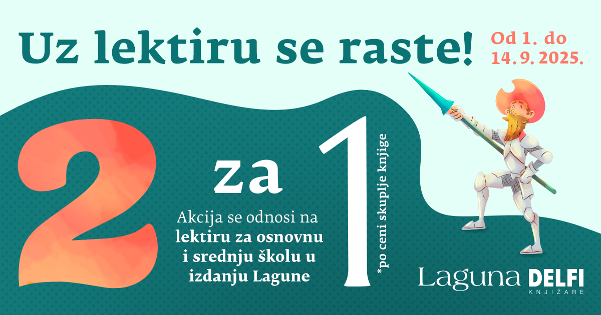 U svim Delfi knjižarama i na sajtovima laguna.rs i delfi.rs, od 1. do 14. septembra 2025. trajaće posebna akcija „2 za 1“ na školsku lektiru u izdanju Lagune! Kupovinom jedne knjige sa akcije po punoj ceni, drugu jeftiniju dobijate za samo 1 dinar!