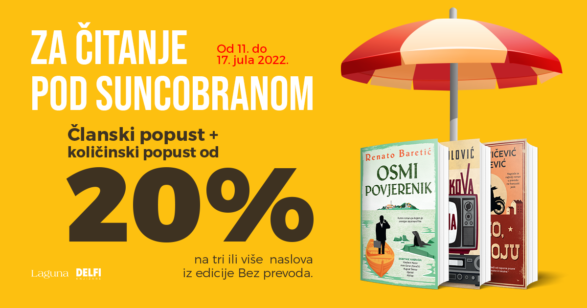 Od 11. do 17. jula u svim knjižarama Delfi, kao i na sajtovima delfi.rs i laguna.rs, očekuje vas odlična akcija „Za čitanje pod suncobranom“, tokom koje ćete moći da nabavite vrhunske naslove iz Lagunine edicije „Bez prevoda“ po posebnoj ceni.