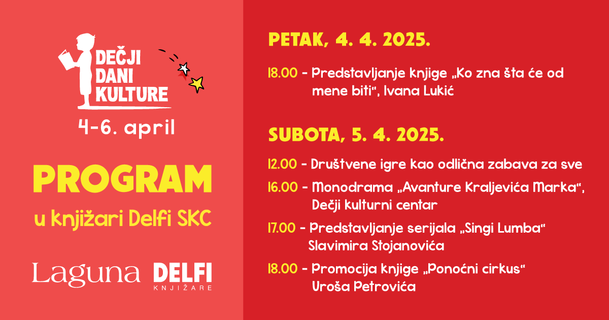 Sjajne knjige, druženja sa piscima, zanimljive radionice, predstava Dečjeg kulturnog centra očekuju mališane tokom Dečjih dana kulture od 4. do 6. aprila 2025. u knjižari Delfi SKC.