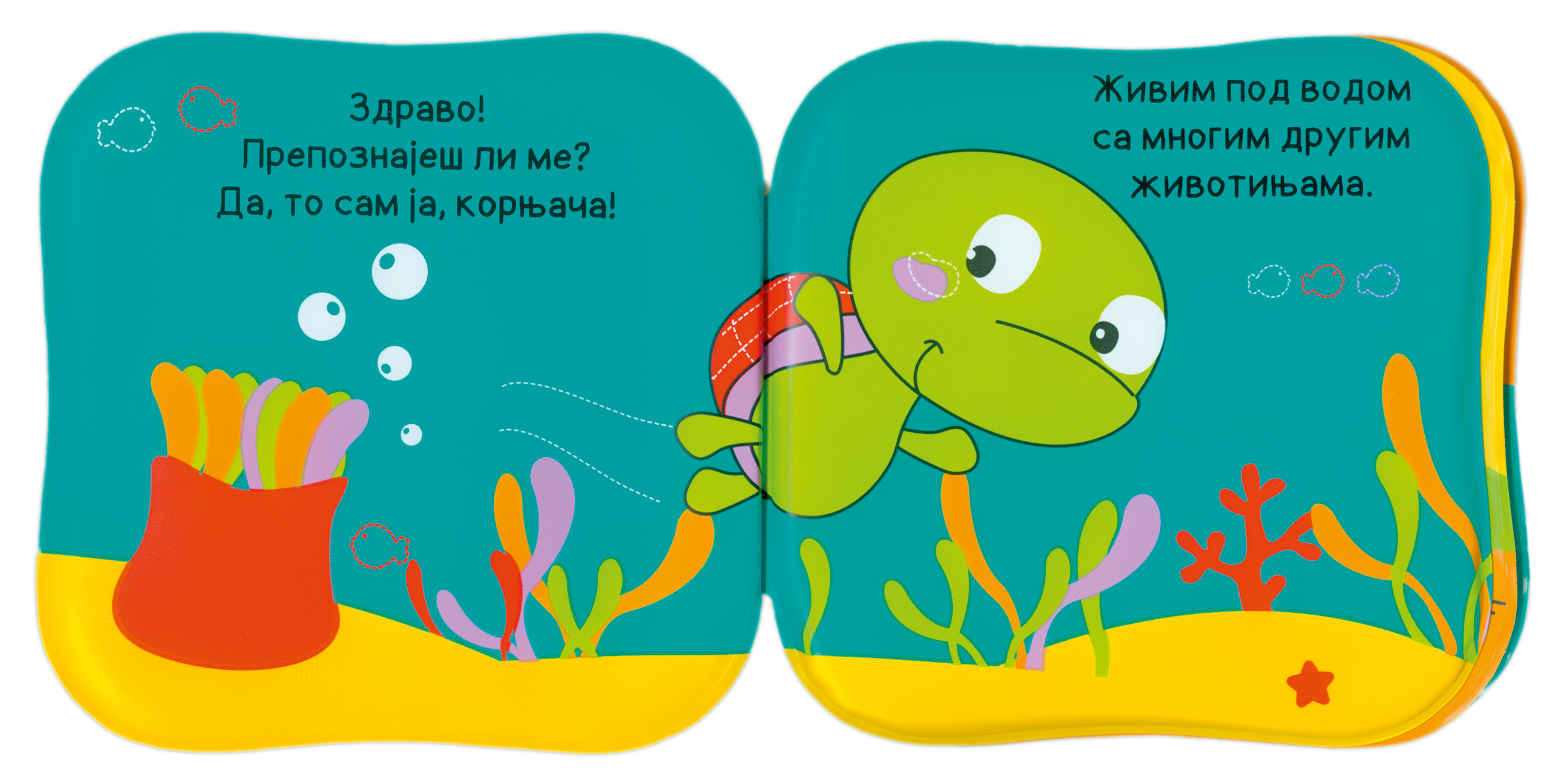 Knjiga za kupanje sa veselim ilustracijama družine ribice klovna, delfina, nilskog konja i kornjače uz koje je kupanje velika zabava!