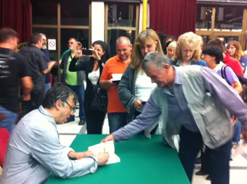 Nakon zvaničnog dela promocije mnogobrojni posetioci sa svojim primerkom knjige „Fajront u Sarajevu“ strpljivo su čekali u redu ne bi li im se autor potpisao i fotografisao s njima.