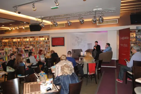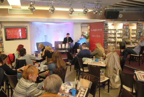 O knjizi su u Delfi Caféu u SKC-u govorili prevodilac romana Jovan Tatić i urednik u Laguni Dejan Mihailović.