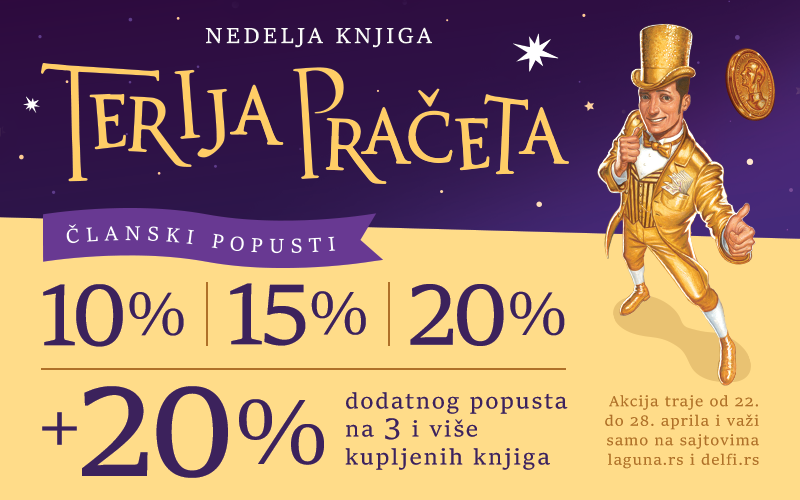 Od 22. do 28. aprila, samo na sajtovima laguna.rs i delfi.rs, odobravamo dodatni količinski popust od 10% na tri ili više kupljenih knjiga Terija Pračeta, na srpskom i engleskom jeziku. Tokom trajanja akcije važiće članski, količinski i fiksni popust.